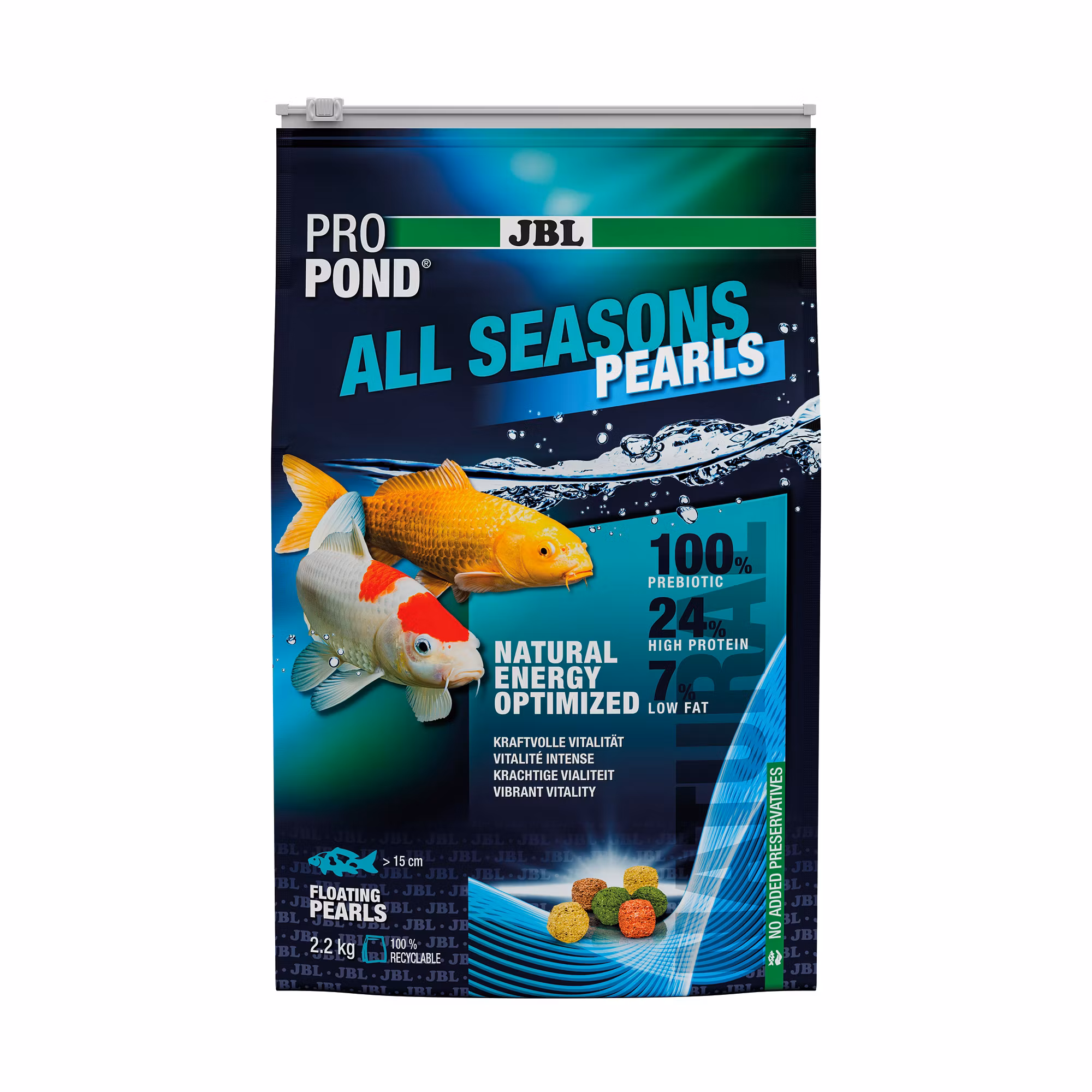 JBL ProPond All Seasons Pearl är ett flytande helfoder i pärlform, vetenskapligt framtaget för att ge dina dammfiskar en balanserad kost oavsett årstid. Med den stora 12-litershinken får du ett högkvalitativt foder som räcker länge och håller dina fiskar friska, aktiva och färgstarka från tidig vår till sen höst.