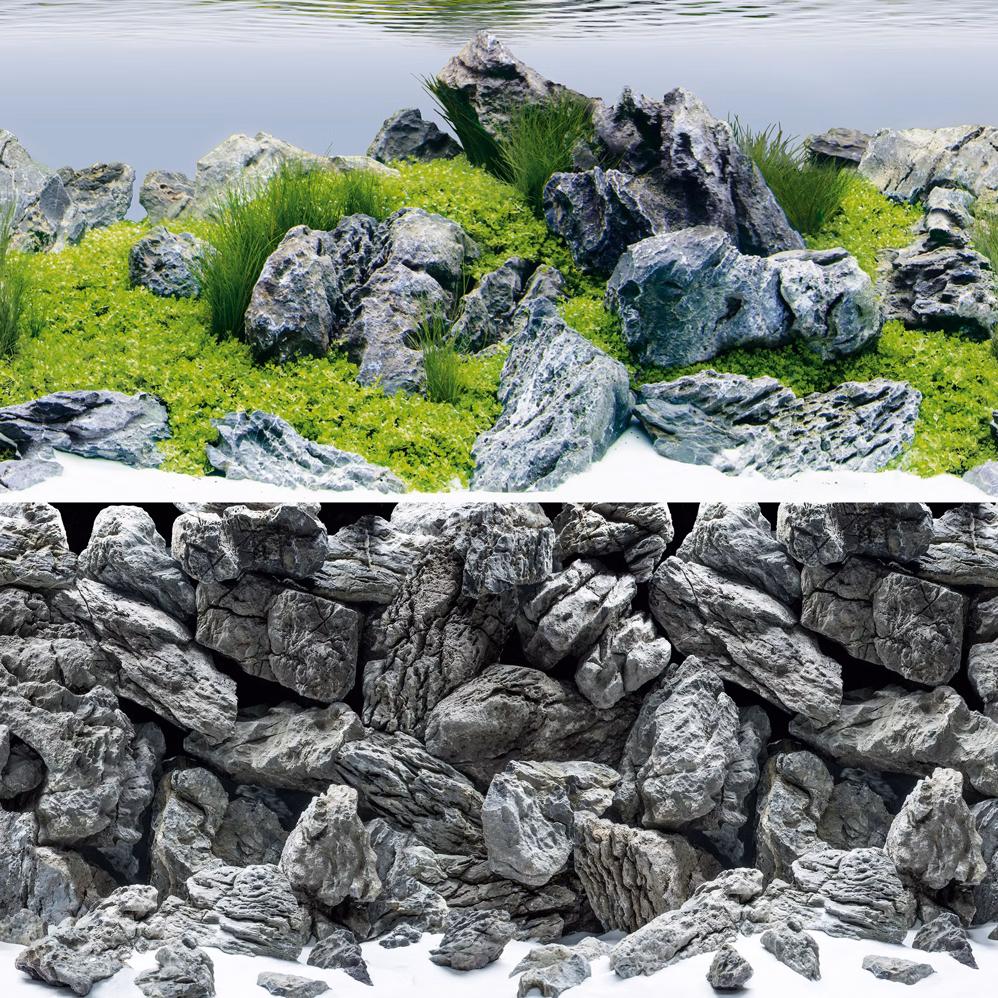 Rock (Sida A): Ett realistiskt motiv av en mörk klippvägg. Denna sida ger akvariet en rå, naturlig karaktär och skapar en fantastisk kontrast mot både ljus sand och färgglada fiskar.
